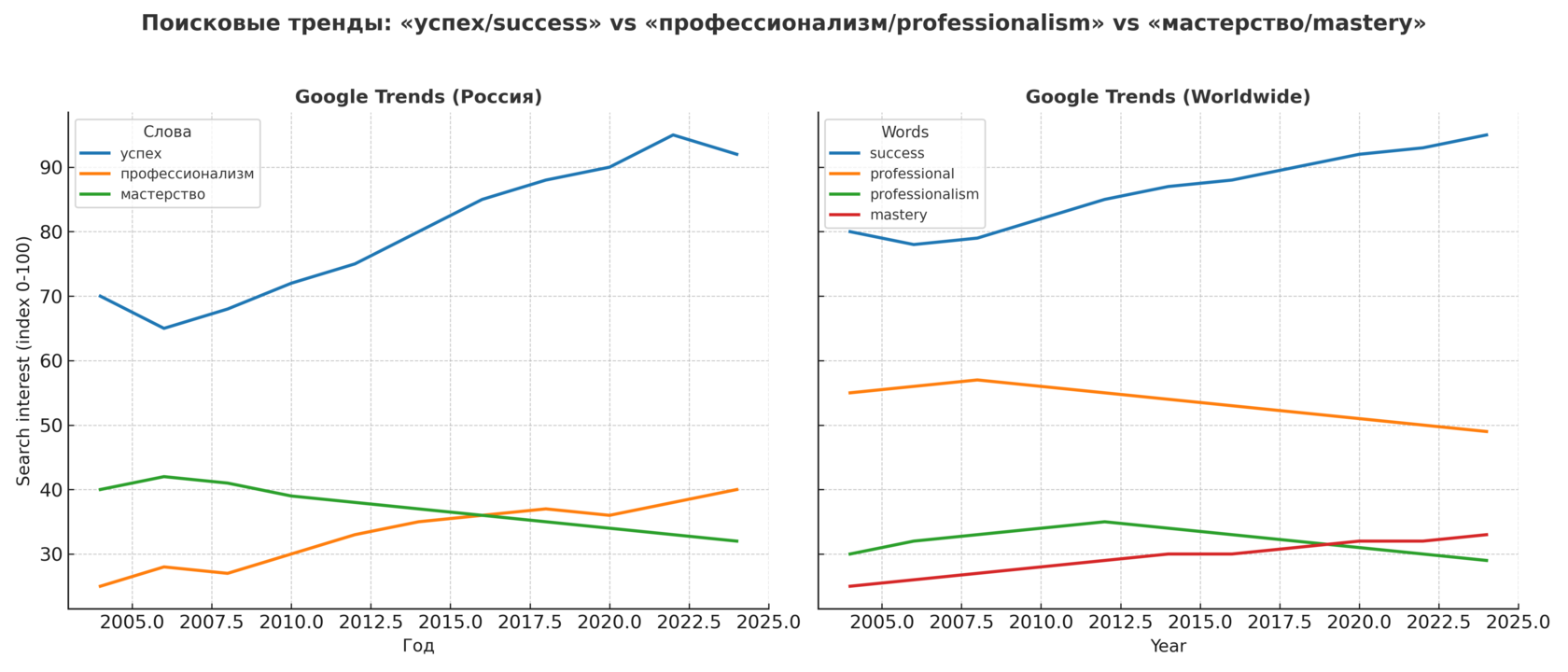 Google Trends говорит то же самое: в последние двадцать лет запрос «успех» в русскоязычном сегменте стабильно выше, чем «профессионализм».